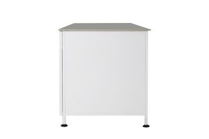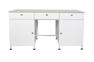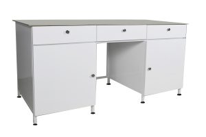 • Міцна та зносостійка конструкція – каркас столу, тумб та шухляд виготовлені з металевого профілю з покриттям полімерної порошкової антибактеріальної фарби, стільниця – з хімічно стійкого пластику, що витримує тривале використання з агресивними реагентами, дезінфікуючими засобами, кислотами та лугами. Матеріал зберігає естетичний вигляд і функціональність навіть за інтенсивної експлуатації.